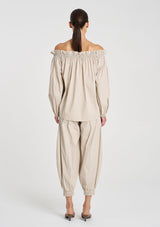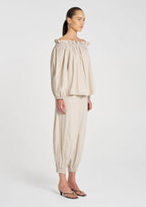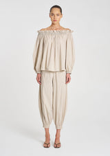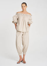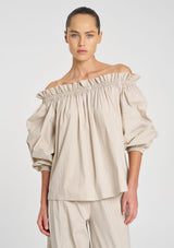 Cut in Mela Purdie's Lightweight Microprene. A crisp, cotton rich fabric with high stretch and a polished finish. The Breeze Blouse features an elasticated neckline versatile to wear on the shoulder or shoulder free.