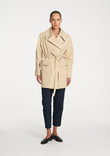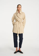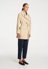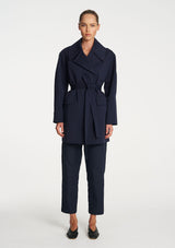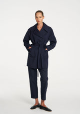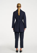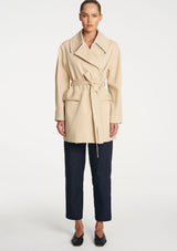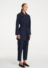 Crafted in Ultra Knit a structured double knit known for its durability and comfortability, The Wrap Trench is a sophisticated piece featuring a large collar, wrap front detail with a waist tie and two welt pockets. This is a great layering piece for the cooler seasons.
