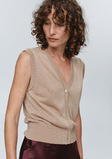The Foundations Vest by Marle is a sleeveless vest constructed from a fine-gauge knit. Featuring a deep V-neckline and centre front placket with contrast shell buttons arranged in a paired configuration.