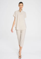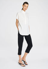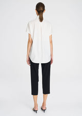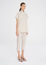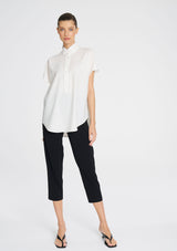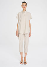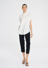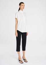 Crafted from Mela Purdie's Flex Weave, a minimalist twill weave with a matte finish. The Tab Stand Shell features a crisp front placket with button closure, a stand collar and cap sleeve.