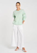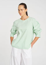 Cut in Mela Purdie's Lightweight Striped Microprene, a crisp, cotton rich fabric with high stretch and a polished finish, featuring a bold yarn dyed stripe. The Resort Top features a classic shirt cuff and relaxed bodice with a clean bound neckline.