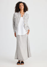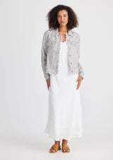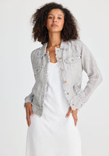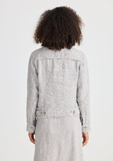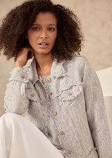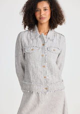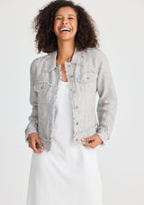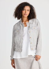 The Monza Jacket by Shanty is a structured and boxy style jacket featuring front pockets, frayed trim features and full length to the hip. This jacket is crafted by a Linen, Cotton blend.