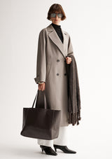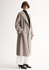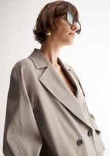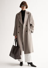 The Corinne Trench by Elka Collective is a full-length coat featuring a double-breasted front with functional buttons, raglan sleeves with adjustable sleeve tabs and buttons and a back vent