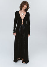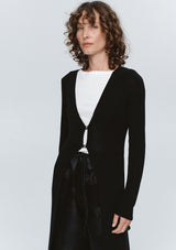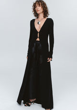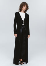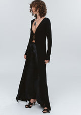 The Willem Jacket by Marle is engineered in a fluid mid-gauge knit composed of tencel, cotton, silk, and cashmere. Designed with an elongated, ankle-grazing shape that follows the body’s natural lines. Secured at the bodice with dual rouleau loop closures for adjustable styling.