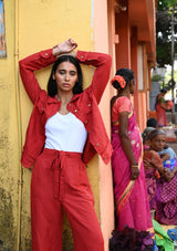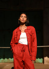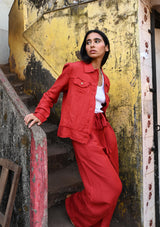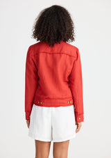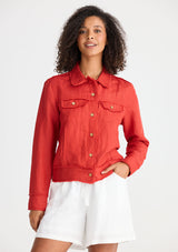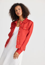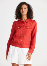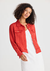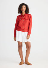 SH25167The Monza Jacket by Shanty is a structured and boxy style jacket featuring front pockets, frayed trim features and full length to the hip. This jacket is crafted by a Linen, Cotton blend.