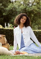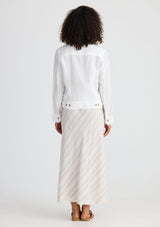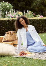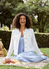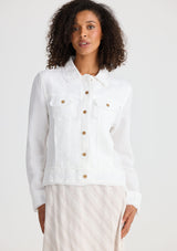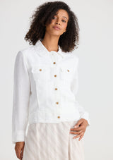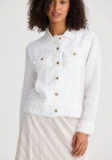 SH25167The Monza Jacket by Shanty is a structured and boxy style jacket featuring front pockets, frayed trim features and full length to the hip. This jacket is crafted by a Linen, Cotton blend.