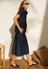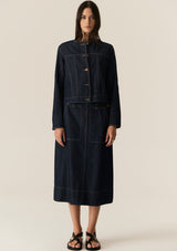 The Carsen Skirt by POL Clothing features a denim midi length and POL’s signature 4 button closure at the hip