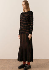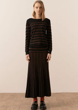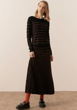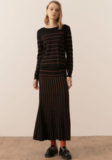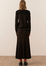 The Gizelle Lurex Pleat Skirt from POL Clothing accentuates delicate lurex stripes throughout, paired with an effortlessly chic A-line silhouette. Designed with comfort in mind, it includes an elasticised waist and a yoke adorned with horizontal lurex stripes. Vertical pleats cascade from below the yoke, each adorned with lurex stripe detailing on either side. Crafted from a luxurious rayon blend knit infused with lurex for added sparkle and texture, this skirt is both stylish and versatile. For a polished ensemble, pair it with the coordinating Lurex Striped Knit top.