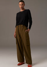 Elastic drawcord with nickel toggle detail creates and adjustable silhouette, wear loose or draw in for a tapered effect