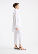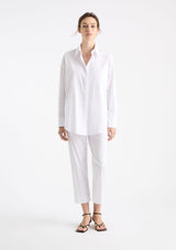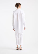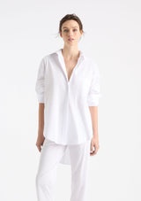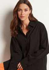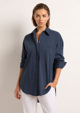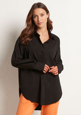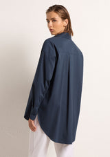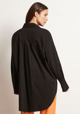 The Relaxed Pocket Shirt by Mela Purdie features a classic shirt collar with button down front opening, single pocket detail on front, full-length sleeves with cuffs and a scooped hemline. The oversized fit makes this the perfect overshirt to wear over slim pants. This versatile shirt is crafted from Microprene; a lightweight stretch fabrication that is machine washable.