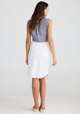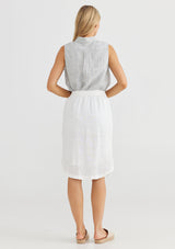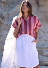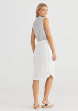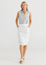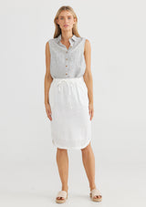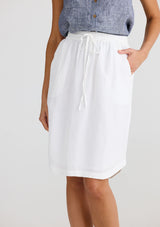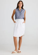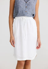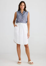 The Khari Skirt from Shanty Corporation features an elasticised waistband with draw string, side pockets and a curved hemline. This knee length skirt is crafted 100% linen; a non-stretch fabrication that is breathable and ideal for everyday wear.
