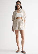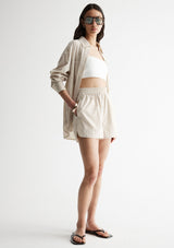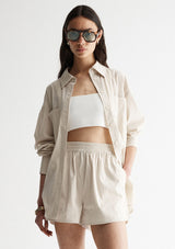 The Delphie Shirt from Elka Collective features a classic collar, button through front, full-length sleeves with cuffs. The back yoke showcases the Elka embroidered monogram and a pleat detail for added sophistication. Crafted from a luxe tencel nylon blend. This short is a timeless addition to any wardrobe. Wear it alone or with the matching Delphie short for elevated weekend wear.