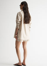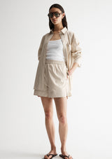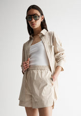 The Poppy Shirt from Elka Collective features a classic collar, button through front, full-length sleeves with cuffs and a curved hemline with side splits. The back yoke showcases the Elka embroidered monogram and a pleat detail for added sophistication. Crafted from a stretch cotton blend, this striped shirt is a timeless addition to any wardrobe. Wear it alone or with the matching Poppy shorts for a polished ensemble.