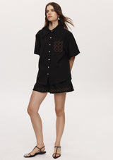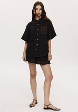 Crafted in 100% linen, the Tegan Shirt features a classic short-sleeve shirt silhouette with elongated sleeves and a standard collar. Secured by contrasting shell buttons down the centre front, wear done up or open and loose as a light layer through the warmer months. Finished with a brown cotton tape appliqué design across the pocket, softly contrasting against the black base cloth.
