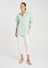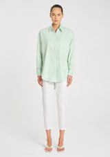 Cut in Mela Purdie's Lightweight Striped Microprene, a crisp, cotton rich fabric with high stretch and a polished finish, featuring a bold yarn dyed stripe. The Relaxed Pocket Shirt is an elevated staple featuring a crisp collar and pocket detailing.