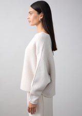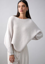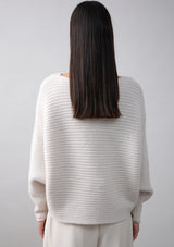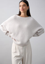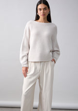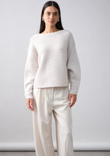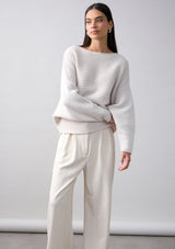 The Essie Sweater by Mia Fratino is crafted from a blend of merino and cashmere. This chunky knit features a boatneck and dropped shoulders