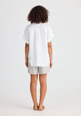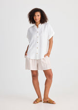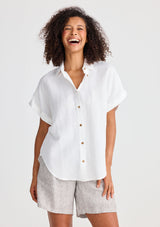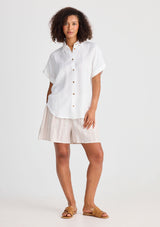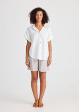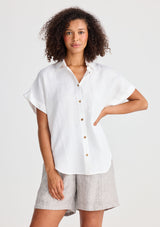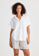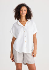 SH25140The Dune Shirt by Shanty features a classic shirt collar, short sleeves and a button down front. This shirt is crafted by a linen and viscose blend.