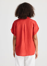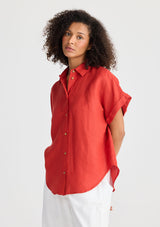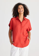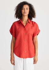 SH25140The Dune Shirt by Shanty features a classic shirt collar, short sleeves and a button down front. This shirt is crafted by a linen and viscose blend.