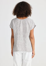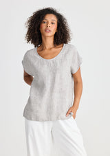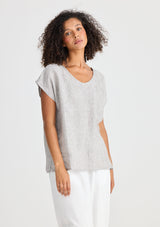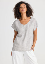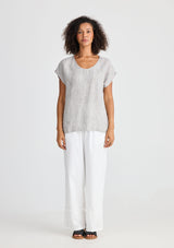 The Havana Tee by Shanty features a soft V-neckline, short sleeves and a full length to the hip. This Tee is crafted but a linen and viscose blend.