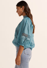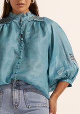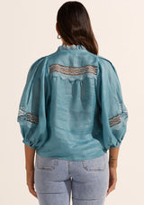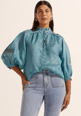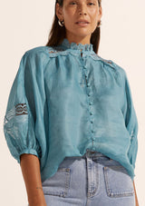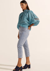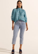 The Quell top leans into both a romantic and vintage aesthetic. Featuring a ruffled neckline and bodice is complemented by an inset shoulder seam and a softly shaped blouson sleeve. The covered buttons are fastened by rouleau loops adding a romantic element. Made in a lightweight ramie, it offers a level of opulence to this piece that easily transitions from dawn to dusk.