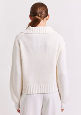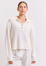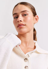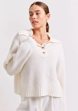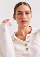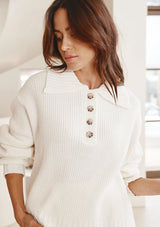 The Ana Sweater from Alessandra features a boxy style silhouette with a slightly oversized collar, button opening and full-length sleeves with wide ribbed detail at the collar, cuffs and hem. This sweater is crafted from a ribbed wool and cashmere blend fabrication.