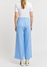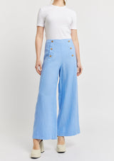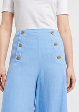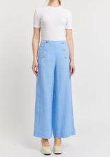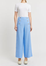 The Atlas Pant from Alessandra features a high waisted flat front with gold button feature, invisible back zipper opening, seam detail and a wide leg silhouette. This pant is crafted from 100% linen, a non-stretch fabrication that is breathable and ideal for everyday wear.
