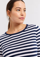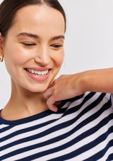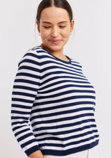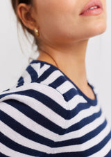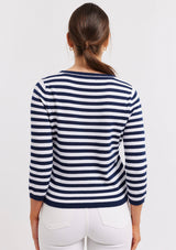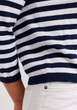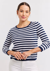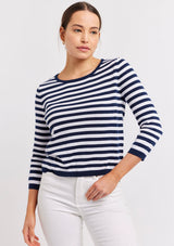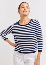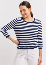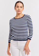 The Riviera Top from Alessandra features a crew neckline, 3/4 sleeves and contrast horizontal stripe. This stripe designer sweater is crafted from a 100% Cotton.