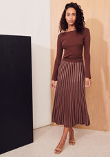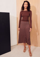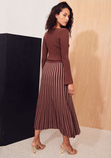 The Dice Skirt from Apartment Clothing brings together an elasticised waist and knitted pleat details with a contrasting trim. Crafted from a knitted rayon-nylon blend, this A-line midi skirt offers a flattering, feminine look.
