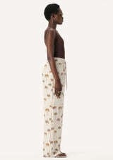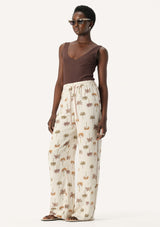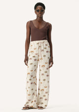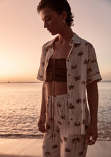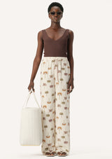 The Athena Pant from Elka Collective features an elastic waistband with drawcord and a relaxed straight leg. This lightweight summer pant is crafted from a viscose and silk blend with a signature palm print that evokes luxe resort wear vibes.