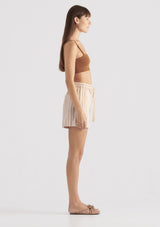 The Gillian Short from Elka Collective is the perfect weekender style. Crafted in a lightweight linen lyocell blend, featuring blush and tan stripe, elasticated waist with tie and hip pockets.
