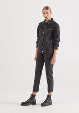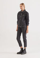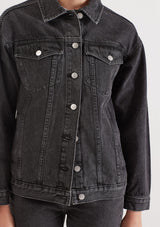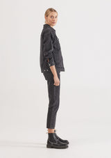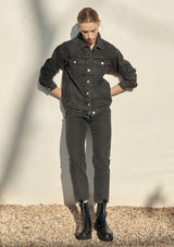 The Nadia Jacket by Elka Collective is cut from a rigid denim and features dropped shoulders, a relaxed oversized boyfriend fit, functional chest pockets and welt hip pockets. Branded with Elka Collective trims.