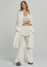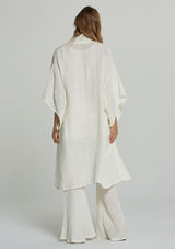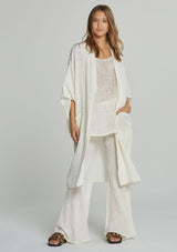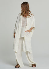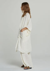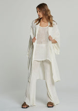This duster is complete with wide sleeves and cut out detail below the arms reminiscent of the traditional kimono. Featuring front pockets for a relaxed feel.