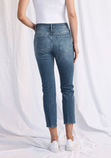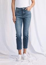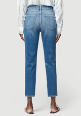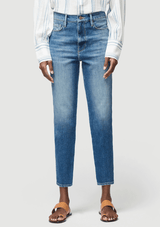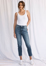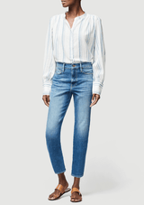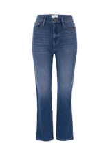 The Le Sylvie Crop Jean is cut for a relaxed look that features a high-waisted straight fit through the hips and thighs. It also features a fly/zip closure and has slight dropped crotch that tapers to the ankle.