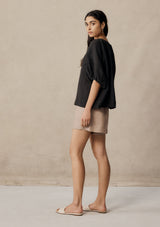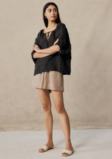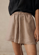 The Anzu Short from New Zealand designer, Marle sit on a wide elasticated waistband secured by a rouleau drawstring. These shorts feature a relaxed silhouette and pockets at the side. This short is crafted in a finely woven linen that features an oat base and thin light pink diagonal stripe.