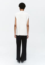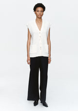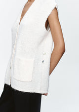 The Bonita Vest is crafted in an Alpaca / Wool yarn finished with a subtle curly texture. This knitted vest features a deep V-neckline secured with agoia buttons down the centre front, in a unique arrangement, with varying spacing. This vest also features two buttons at the side, offering multiple styling options and varying silhouettes.