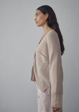 The Darcie Cardi by New Zealand designer, Marle is knitted in a luxuriously soft cashmere. It features a flattering, feminine deep V-neck with patch pocket detail, loose long sleeves and a boxy fit. This cardigan has three oversized shell buttons down the centre front, which can be worn closed or undone.