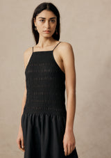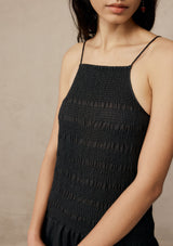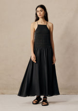 The Devyn Dress from New Zealand designer, Marle is crafted in a signature flax linen. It features a narrow square neckline and thin rouleau straps. The top half of this dress features a fitted form with full body elasticated shirring which stops at the hips before falling into a full skirt. This is a mid-length dress, falling to the ankle.