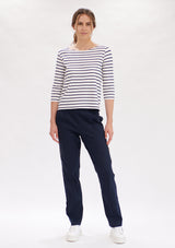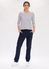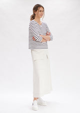 The Mela Purdie Relaxed Boatneck features a softly scooped boat neckline and 3/4 length sleeves. This style falls to the hip and is crafted from this seasons’ artisan stripe matte jersey, offering comfort, durability and stretch.