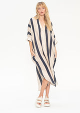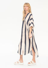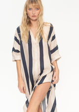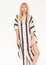 The Cabana Slide from Mela Purdie features a V-neckline falling to an exposed button up placket, allowing to open as an over-shirt with a dramatic, curved hem and short, cuffed sleeves. Effortless and relaxed, this slide is beautiful worn as a separate or paired over a textured linen pant. Crafted from high quality European linen, Mela’s Block Stripe adds a hint of texture with a light airy feel, a contemporary addition to your summer wardrobe.