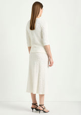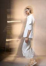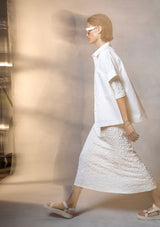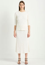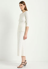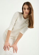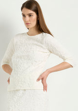 The Cloque T from Mela Purdie features a crew neckline, ¾ length sleeves and a form fit that falls to the hip. This top is crafted from Mela’s newly introduced textured Cloque fabrication. Its stretchy material and flattering silhouette offer both comfort and style. Pair with the Cloque Skirt or Bolero to complete the look.