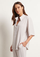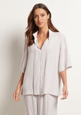 The Mache Bevel Neck Plaza from Mela Purdie features a petite stand collar with a subtle V neckline, wide pleat detailing at front, ¾ length sleeves and finished with a straight hemline. This elegant top is crafted from 100% technical polyester. Mache offers a full bodied, high fashion look that combines style and comfort in a user-friendly fabrication that is machine washable and ideal for travel.