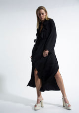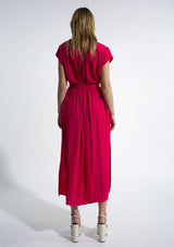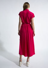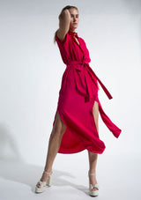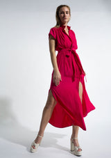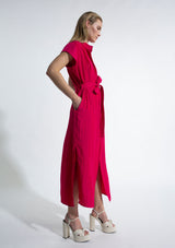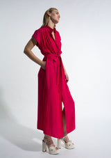 The SS Soft Dress by Mela Purdie features a stand collar with cap sleeves, luxurious detailing with pleat folds through the shoulders and a detachable, soft tie belt to cinch you in at your waist and a high split hem. This versatile dress can also be worn open as a duster. Crafted from 100% technical polyester, Mache offers a full bodied, high fashion look that combines style and comfort in a user-friendly fabrication, that is machine washable and ideal for travel.