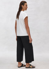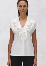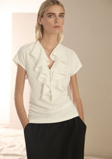 The Wave Shell from Mela Purdie features a v-neckline with soft ruffle detail, cap sleeves and a relaxed fit that falls to the hip. Crafted from Mela Purdie's matte Powder Knit, this versatile top offers a unique blend of softness and subtle structure. The matte finish provides a refined look, while the stretch ensures a comfortable, flattering fit that moves with you.