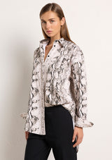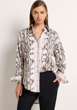 The Relaxed Pocket Shirt from Mela Purdie features a classic shirt collar with button down opening, single pocket detail on front, full-length sleeves with cuffs and a scooped hemline. The oversized fit makes this the perfect over-shirt to wear over slim pants. This versatile shirt is crafted in the striking Python Print Popilene, Mela Purdie's crisp, stretchy & smooth to touch fabrication.