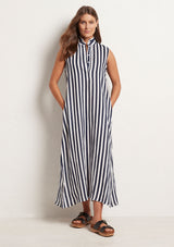 The Ribbon Stripe Linen Tab Slide Dress from mela Purdie features a petite stand collar and firm button placketing through the front. This sleeveless midi dress is comfortable and flattering with pockets and side splits offer extra movement. This effortlessly chic dress is set become a season favourite. Crafted from high quality European linen, Mela’s Ribbon Stripe adds a hint of texture with a light airy feel.