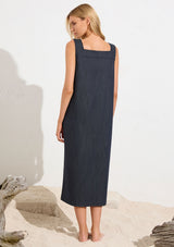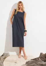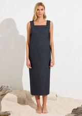 Mela Purdie's Soft Denim fabric, characterised by its super 4-way Stretch & memory. The Cube Dress offers a timeless yet comfortable shift silhouette for all occasions.