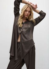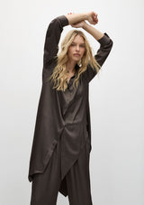 Crafted from Stretch Gloss, a premium technical stretch Satin with a glass sheen. The Veil Tunic features a high neck collar and long asymmetrical hemline with one side split