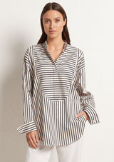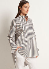 The Relaxed Yoke Shirt from Mela Purdie features a tall stand collar, front yoke panelling with a concealed button front placket, full length sleeves with buttoned shirt cuffs, back yoke with pleat detailing and a high/low curved hemline. Crafted from best-selling Microprene; a lightweight cotton stretch fabrication that is machine washable.