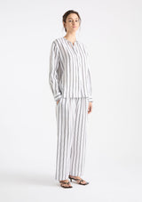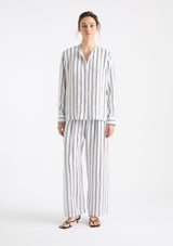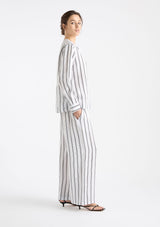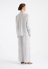 The Shell Shirt from Mela Purdie features a softly bound crew neckline with concealed button closure, full length sleeves, a pleat at the back to encourage ease of movement and a boxy cut through the body. This top is crafted from a breathable, mid weight European Pure Linen in the timeless Trio Stripe Print, offering a boxy fit through the body and a beautiful light airy feel.