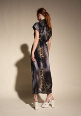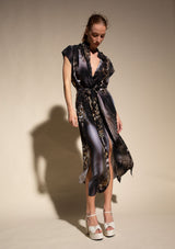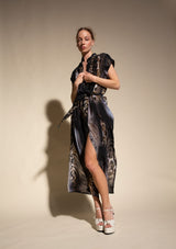 The SS Soft Dress by Mela Purdie features a stand collar with cap sleeves, luxurious detailing with pleat folds through the shoulders and a detachable, soft tie belt to cinch you in at your waist and a high split hem. This versatile dress can also be worn open as a duster. Cut from Mela's Silk Crepe De Chine, a luxuriously lightweight Silk boasting a sumptuous soft handle, matte surface and beautiful drape. Zulu boasts an incredible marbleised animal print that has impact and longevity